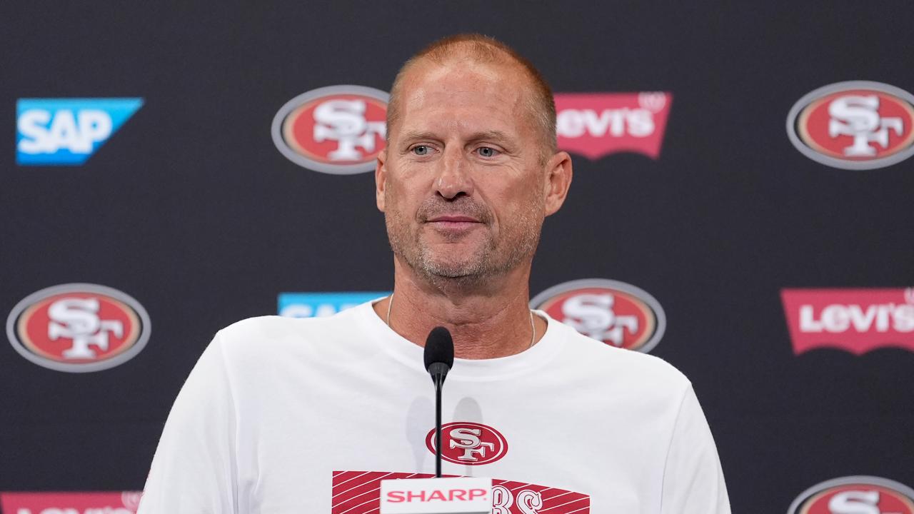 San Francisco 49ers special teams coordinator Brian Schneider speaks at a news conference during NFL football training camp in Santa Clara, Calif., July 30, 2024. (AP/Jeff Chiu)