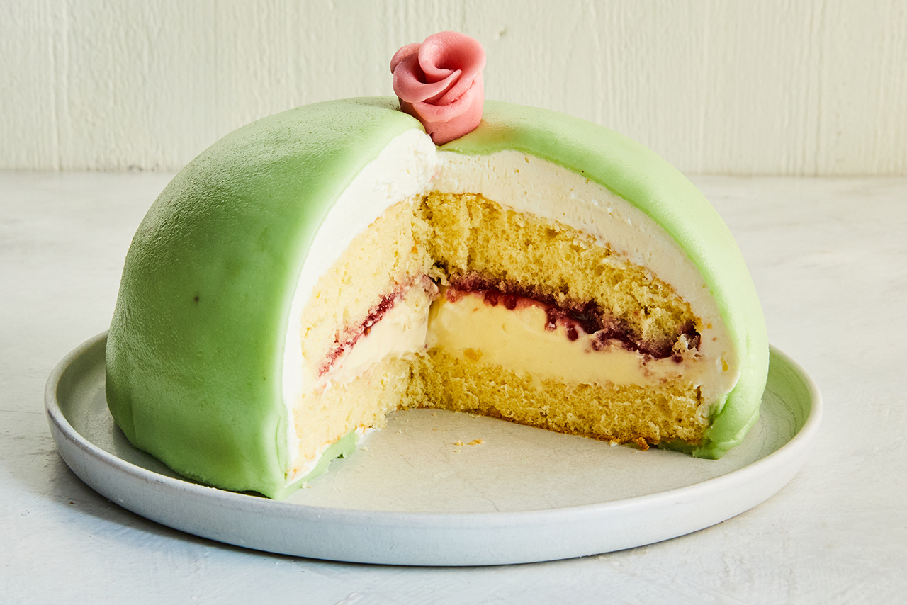 Princess Cake, or Prinsesstårta, makes a spectacular centerpiece for any celebration, but despite its regal appearance, this simplified version is far easier to make than it looks. The original recipe from Sweden called for three layers of soft spongecake and custard, coated with stiffly whipped cream and covered with a thin layer of green-dyed mandelmassa (almond paste), finished with a single pink rose. While the essence and color scheme have endured, almond paste has been replaced with sweeter, smoother marzipan, and the pleasing domed shape — thought to allude to a crown — is a modern addition. Purists may argue that jam, which did not appear in the original recipe but is a fixture of contemporary versions, does not belong, though the tart tang is most welcome among the sweet muddle of soft, creamy layers. Here, the usual three cake layers are reduced to two, and using good-quality shop-bought jam saves time. The entire cake is built in a bowl, allowing you to take your time with each layer. Once turned out, it reveals a beautifully smooth dome, fit for any princess.