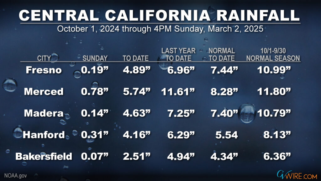 Fresno’s seasonal rain total now stands at 4.89 inches, which is 65.7% of normal to date.